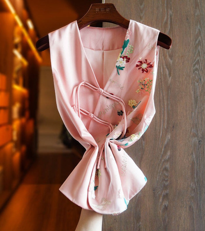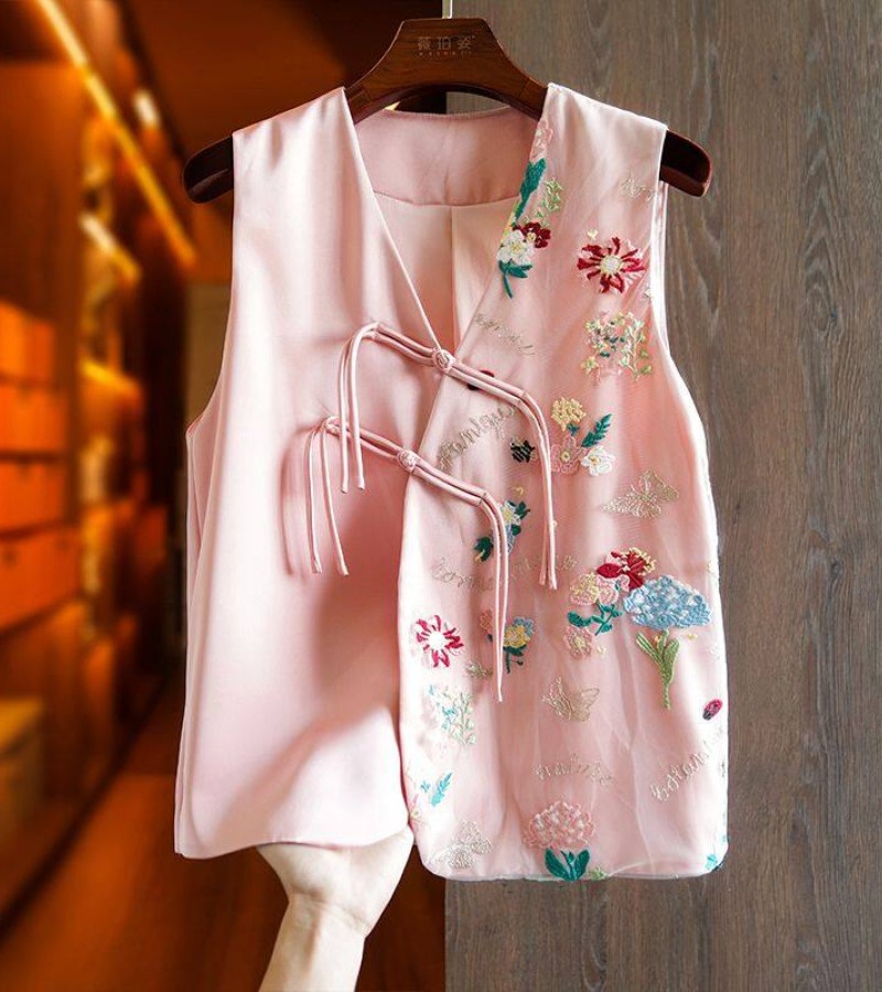 Joso杏粉色高级夏季感中式背心女式夏装原创设计网眼刺绣乡村风板扣上衣